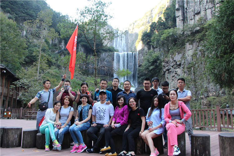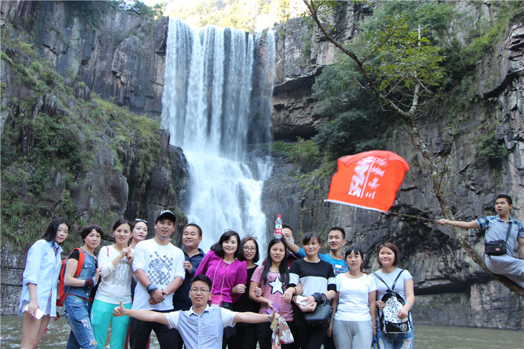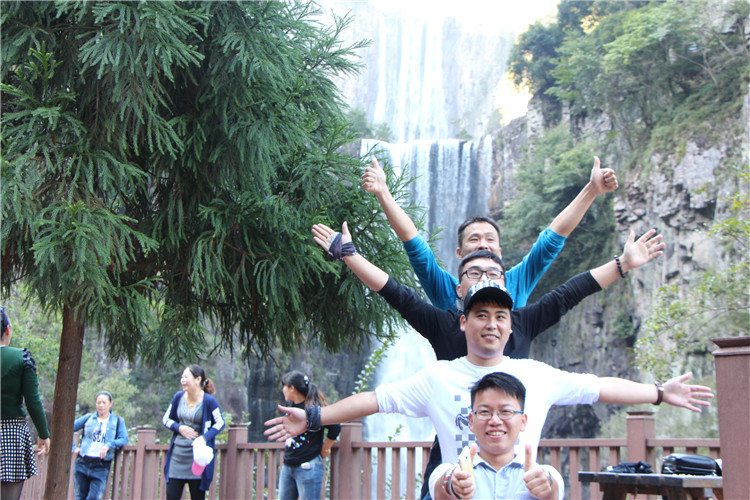 游山玩水之余,也不忘給我們美女帥哥留景做紀念。美景配美女,讓我舍不得這地方了,從下往上觀看,一條白練從空而降,水聲嘩嘩作響,撞擊在石頭上的細小水珠彌漫山間,氣勢磅礴。