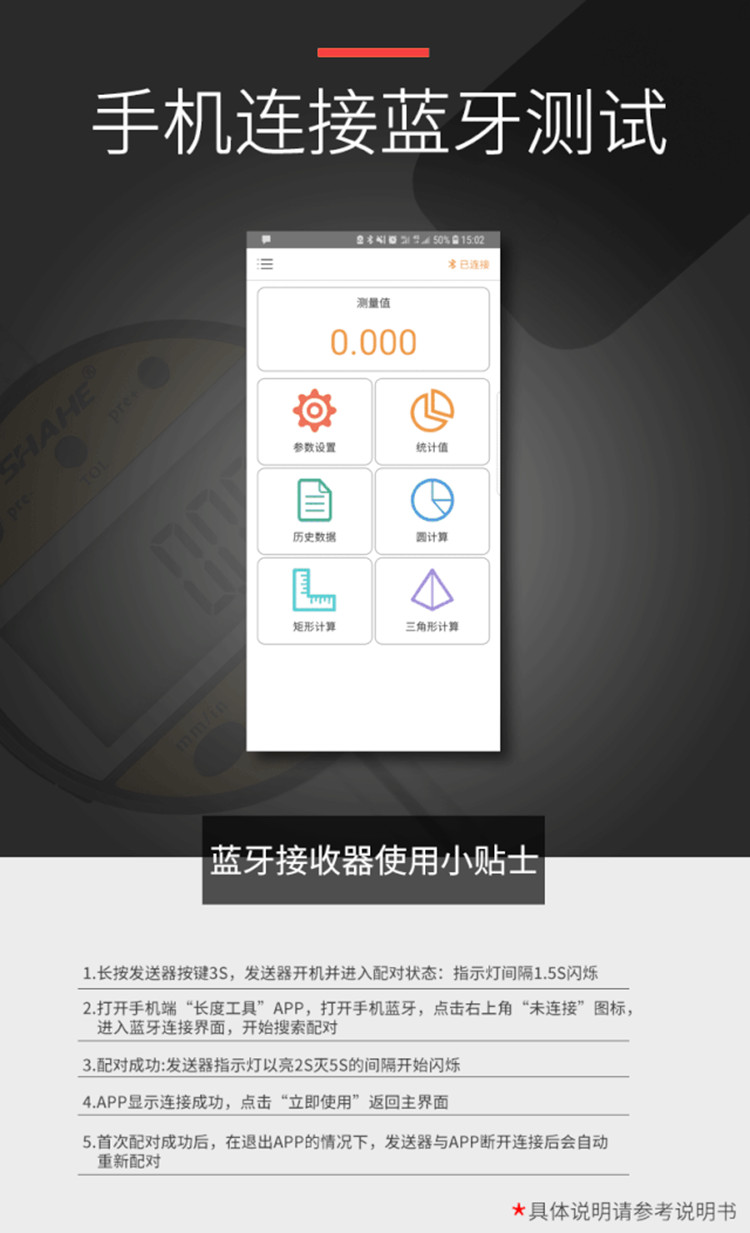 數(shù)顯卡尺鏈接無(wú)線(xiàn)射頻數(shù)據(jù)傳輸及藍(lán)牙傳輸技術(shù),射頻數(shù)據(jù)1對(duì)20(即20個(gè)數(shù)據(jù)可同時(shí)采集且30米內(nèi)無(wú)障礙傳輸)。可手機(jī)下載⏬APP,設(shè)上限下限自動(dòng)判斷結(jié)果,保存統(tǒng)計(jì)數(shù)據(jù),不論你是圓形️長(zhǎng)方形或三角形️都可根據(jù)半徑,直徑或長(zhǎng)度等自動(dòng)測(cè)量生成周長(zhǎng),面積等功能,真正實(shí)現(xiàn)室內(nèi)室外最便捷有效的計(jì)量檢測(cè),三和計(jì)量迎來(lái)了隨時(shí)隨地測(cè)量最精確數(shù)值的量具新時(shí)代高峰期!